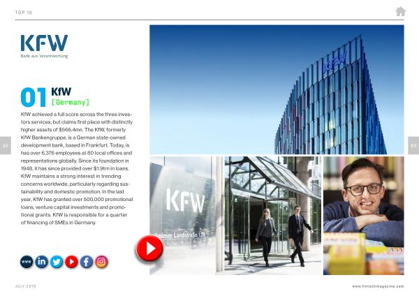 KfW achieved a full score across the three investors services , but claims first place with distinctly higher assets of $ 566.4mn . The KfW , formerly KfW Bankengruppe , is a German state-owned development bank , based in Frankfurt . Today , is has over 6,376 employees at 80 local offices and representations globally . Since its foundation in 1948 , it has since provided over $ 1.9trn in loans . KfW maintains a strong interest in trending concerns worldwide , particularly regarding sustainability and domestic promotion . In the last year , KfW has granted over 500,000 promotional loans , venture capital investments and promotional grants . KfW is responsible for a quarter of financing of SMEs in Germany . JULY 2019