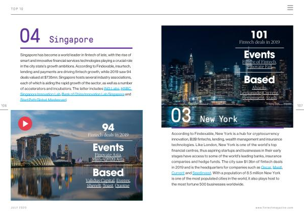 Singapore has become a world leader in fintech of late , with the rise of smart and innovative financial services technologies playing a crucial role in the city state ’ s growth ambitions . According to Findexable , insurtech , lending and payments are driving fintech growth , while 2019 saw 94 deals valued at $ 735mn . Singapore hosts several industry associations , each of which is aiding the rapid growth of the sector , as well as a number of accelerators and incubators . The latter includes ING Labs , HSBC Singapore Innovation Lab , Bank of China Innovation Lab Singapore and Start Path Global , Mastercard . 94 Fintech deals in 2019