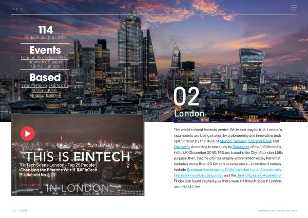 The world ’ s oldest financial centre . While that may be true , London ’ s incumbents are being shaken by a pioneering and innovative tech spirit driven by the likes of Monzo , Revolut , Starling Bank and OakNorth . According to one study by Beauhurst , of the 1,139 fintechs in the UK ( December 2019 ), 75 % are based in the City of London . Little surprise , then , that the city has a highly active fintech ecosystem that includes more than 20 fintech accelerators – prominent names include Barclays Accelerator , Citi Innovation Labs , Accenture ’ s FinTech Innovation Lab London and the Bank of England Accelerator . Findexable found that last year there were 114 fintech deals in London , valued at $ 2.1bn . www . fintechmagazine . com