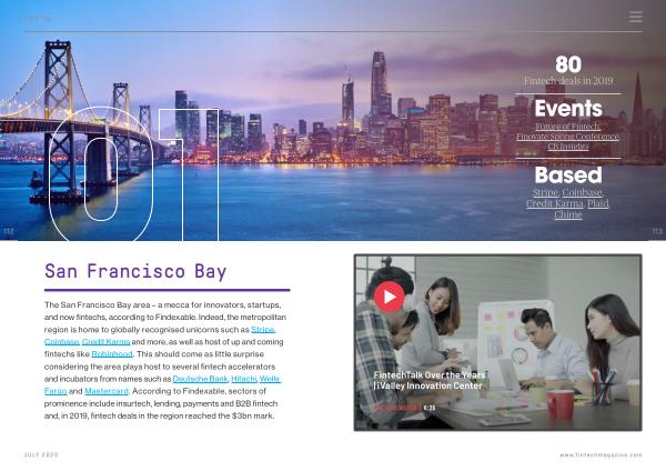 The San Francisco Bay area – a mecca for innovators , startups , and now fintechs , according to Findexable . Indeed , the metropolitan region is home to globally recognised unicorns such as Stripe , Coinbase , Credit Karma and more , as well as host of up and coming fintechs like Robinhood . This should come as little surprise considering the area plays host to several fintech accelerators and incubators from names such as Deutsche Bank , Hitachi , Wells Fargo and Mastercard . According to Findexable , sectors of prominence include insurtech , lending , payments and B2B fintech and , in 2019 , fintech deals in the region reached the $ 3bn mark .