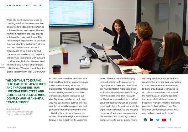 — Benjamin Maxim , Assistant Vice President of Digital Strategy and Innovation , MSUFCU solution , which enables people to lock their credit card if they lose or misplace it . We ’ re also working with them on travel-related APIs and to reduce fraud when travelling overseas . In addition , we worked with Visa to develop our Visa Signature cash back credit card . Visa has been a great partner and has enabled us to add many products and services benefitting our membership .” With the future in mind , Maxim has an idea of the effect digital will continue to have in the industry in the upcoming