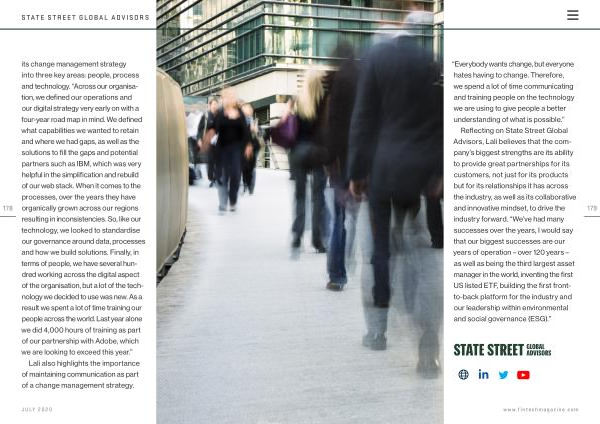 Reflecting on State Street Global Advisors , Lali believes that the company ’ s biggest strengths are its ability to provide great partnerships for its customers , not just for its products but for its relationships it has across the industry , as well as its collaborative and innovative mindset , to drive the industry forward . “ We ’ ve had many successes over the years , I would say that our biggest successes are our years of operation – over 120 years – as well as being the third largest asset manager in the world , inventing the first US listed ETF , building the first frontto-back platform for the industry and our leadership within environmental and social governance ( ESG ).”