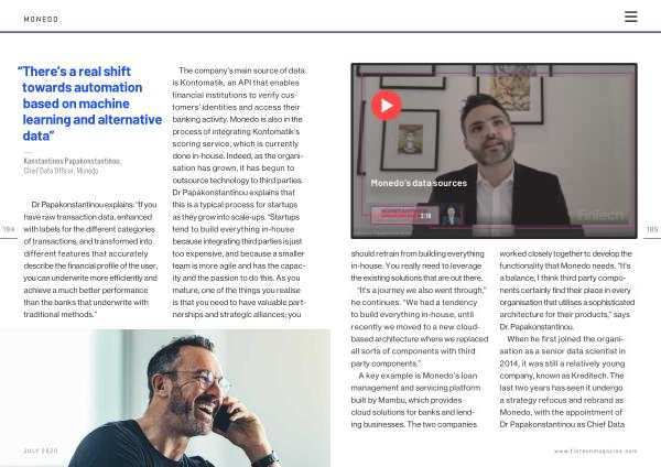 The company ’ s main source of data is Kontomatik , an API that enables financial institutions to verify customers ’ identities and access their banking activity . Monedo is also in the process of integrating Kontomatik ’ s scoring service , which is currently done in-house . Indeed , as the organisation has grown , it has begun to outsource technology to third parties . Dr Papakonstantinou explains that this is a typical process for startups as they grow into scale-ups . “ Startups tend to build everything in-house because integrating third parties is just too expensive , and because a smaller team is more agile and has the capacity and the passion to do this . As you mature , one of the things you realise is that you need to have valuable partnerships and strategic alliances ; you