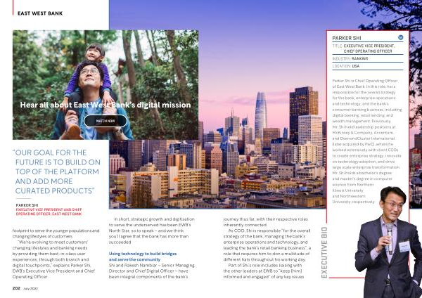 Parker Shi is Chief Operating Officer of East West Bank . In this role , he is responsible for the overall strategy for the bank , enterprise operations and technology , and the bank ’ s consumer banking business , including digital banking , retail lending , and wealth management . Previously , Mr . Shi held leadership positions at McKinsey & Company , Accenture , and DiamondCluster International ( later acquired by PwC ), where he worked extensively with client CEOs to create enterprise strategy , innovate on technology adoption , and drive large scale enterprise transformation . Mr . Shi holds a bachelor ’ s degree and master ’ s degree in computer science from Northern Illinois University and Northwestern University , respectively . journey thus far , with their respective roles inherently connected .