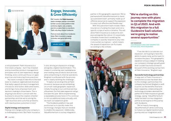 Successful technology partnerships A large part of Pekin Insurance ’ s transitional success has been due to the strategic partnerships the company has formed . Bingham is swift to point out the benefits that have been reaped by collaborating with technology providers deemed the perfect fit for Pekin Insurance ’ s growth strategy , saying : “ ValueMomentum really has been our key integration partner as we ' ve gone on this journey with Guidewire .