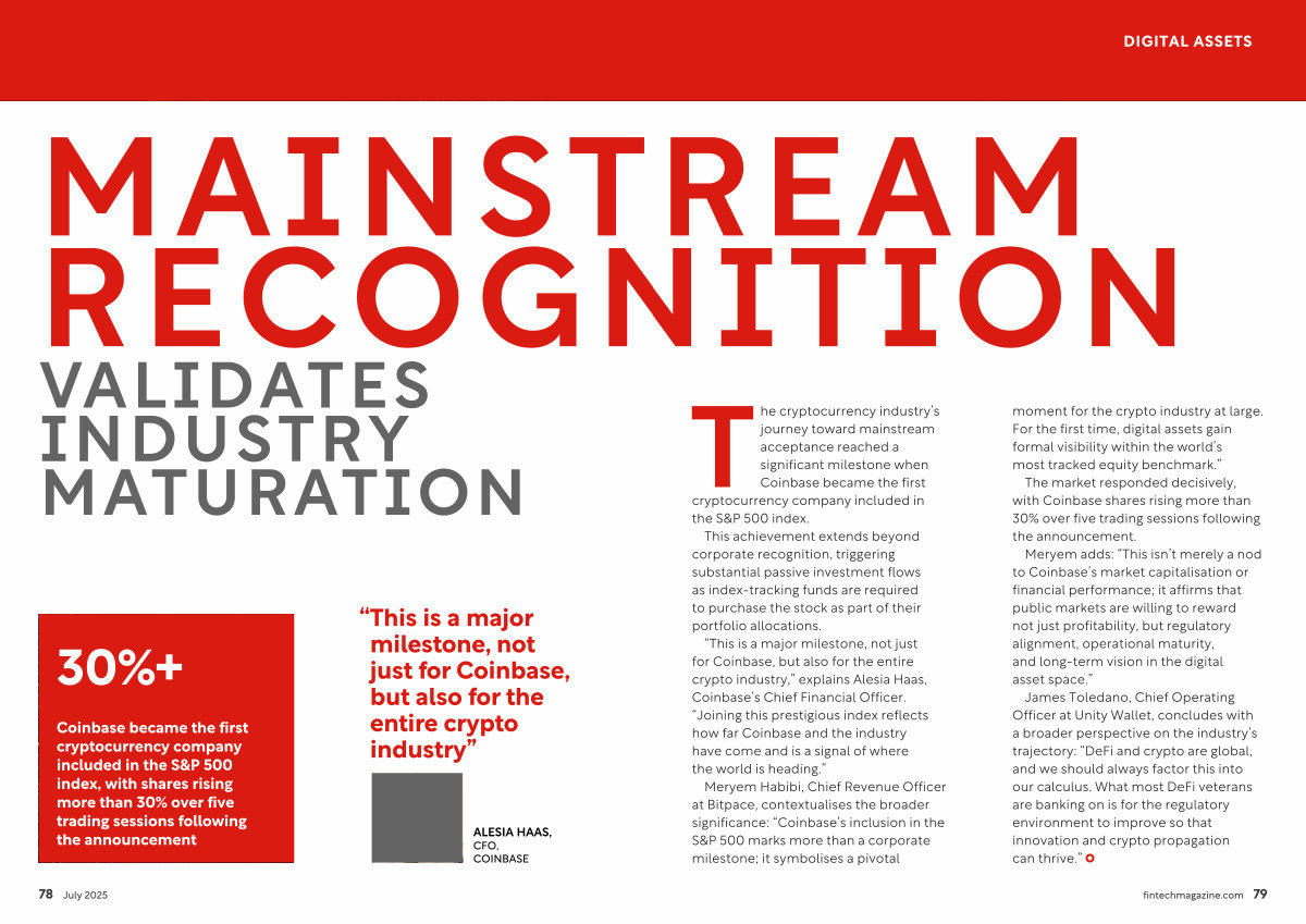 Meryem Habibi, Chief Revenue Officer at Bitpace, contextualises the broader significance:“ Coinbase’ s inclusion in the S & P 500 marks more than a corporate milestone; it symbolises a pivotal