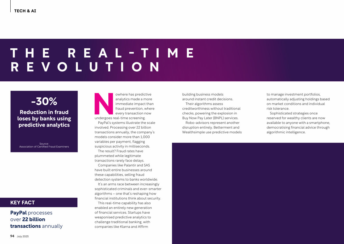 This real-time capability has also enabled an entirely new generation of financial services. Startups have weaponised predictive analytics to challenge traditional banking, with companies like Klarna and Affirm