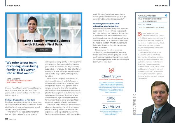 He is a board member of the St . Louis Chapter of InfraGard , Co-Founder of the State of Cyber Annual Security Conference , and a Lifetime member of FBI Citizens Academy . Possessing security certifications in CISSP , CISM , CRISC , and Security +, Ashworth currently oversees First Bank ’ s Information Security Department , Corporate Security , and the Network Services Department .