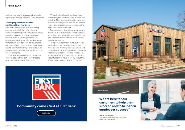Training to protect users on the front line of the cyber threat First Bank has several annual training programmes that they offer , from a compliance standpoint . They also conduct monthly targeted phishing campaigns that function as training exercises to keep people informed , alongside training materials , so that if people do fail , there ’ s refreshers from time-to-time , as well as a weekly newsletter with tips and updates on current events in the cyber world , such as recent breaches .
