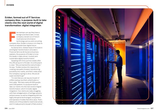 “ It ’ s rare that you can say you ’ re part of a € 5bn startup , but that ’ s what Eviden is ,” Sinni adds . “ We have nearly 60,000 people and 2,100 patents . It is purpose-built to take our clients into the next world of digital transformation , which includes digital integration . Our clients are really struggling with their amalgamation of heritage systems and processes , as well as integrating with the highly disruptive technologies , ecosystems and operation models that drive value . That ’ s where a lot of the problems need to be solved , and I ’ m really proud to be part of that solution .”