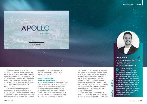 Apollo since 2013 and was instrumental in the setup of ibott . With over a decade of experience with casualty and innovation , which he has a passion for , Chris believes in insurance products being an enabler for new progressive business models such as the sharing economy . He is FCII and CRIS qualified , as well as sitting on the Lloyd ’ s innovation panel and the Lloyd ’ s Market Association Committee for both US and International Casualty .