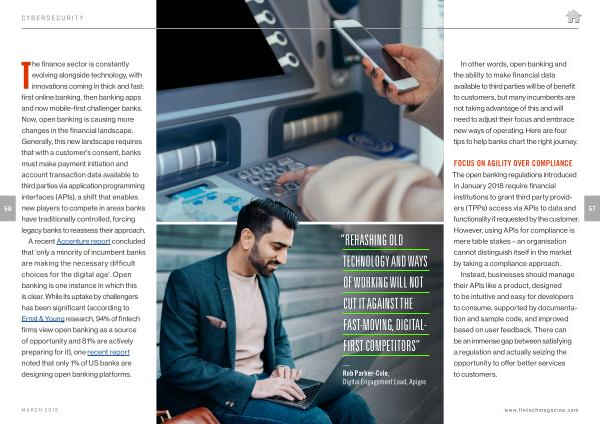 The finance sector is constantly evolving alongside technology , with innovations coming in thick and fast : first online banking , then banking apps and now mobile-first challenger banks . Now , open banking is causing more changes in the financial landscape . Generally , this new landscape requires that with a customer ’ s consent , banks must make payment initiation and account transaction data available to third parties via application programming interfaces ( APIs ), a shift that enables new players to compete in areas banks have traditionally controlled , forcing legacy banks to reassess their approach .