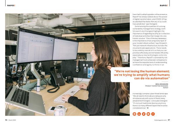 Summarising the qualities of a strong vulnerability management strategy , both Sitcawich and Grangard highlight the importance of regarding security as a collection of individual activities that merge into one holistic solution . “ One of the key takeaways is the importance of securing every layer of your modern attack surface ,” says Sitcawich . “ Not just network infrastructure , but also the cloud and web applications . There needs to be visibility over all of it so that you can prioritise effectively and remediate efficiently , especially as new technologies come into play .” Therefore , Rapid7 ’ s vulnerability risk management tools empower companies to achieve the requisite level of understanding , confidence and agility to thrive in an