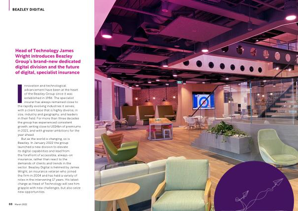 But as the world is changing , so is Beazley . In January 2022 the group launched a new division to elevate its digital capabilities and lead from the forefront of accessible , always-on insurance , rather than react to the demands of clients and trends in the sector . Beazley Digital is helmed by James Wright , an insurance veteran who joined the firm in 2004 and has held a variety of roles in the intervening 17 years . His latest charge as Head of Technology will see him grapple with new challenges , but also seize new opportunities .