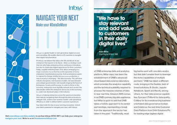 127 of DNB enterprise data and analytics platform , Millar says , has been the establishment of DNB ’ s advanced cloud based data science laboratory which provides the analytics capability and the technical scalability required to process the massive volumes of data in near real time . Amazon AWS comes in as DNB ’ s primary big data appliance , but Millar is quick to add that DNB takes a holistic approach to its vendor partnerships , representing a break from the approach the sector has taken in the past : “ Traditionally , most big banks went with one data vendor , but that didn ’ t enable them to leverage the niche capabilities of multiple partners .” DNB has taken a different route , bringing in the flexible , best of breed solutions : R-Studio , Jupyter Notebook , Spark and Neo4j , among others , for their data science capabilities ; Syncsort ( Trillium ) for data quality ; Collibra for its crowdsourcing business orientated data governance toolset ; and Celebrus , the real-time Customer Data Platform from D4t4 Solutions Plc for leading edge tagless digital