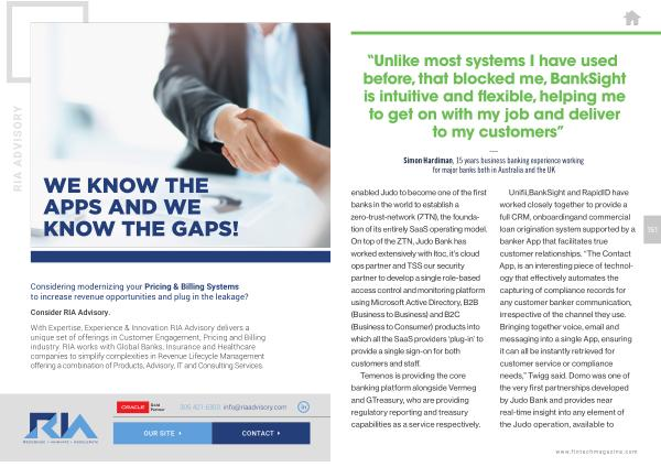 Unifii , BankSight and RapidID have worked closely together to provide a full CRM , onboardingand commercial loan origination system supported by a banker App that facilitates true customer relationships . “ The Contact App , is an interesting piece of technology that effectively automates the capturing of compliance records for any customer banker communication , irrespective of the channel they use . Bringing together voice , email and messaging into a single App , ensuring it can all be instantly retrieved for customer service or compliance needs ,” Twigg said . Domo was one of the very first partnerships developed by Judo Bank and provides near real-time insight into any element of the Judo operation , available to
