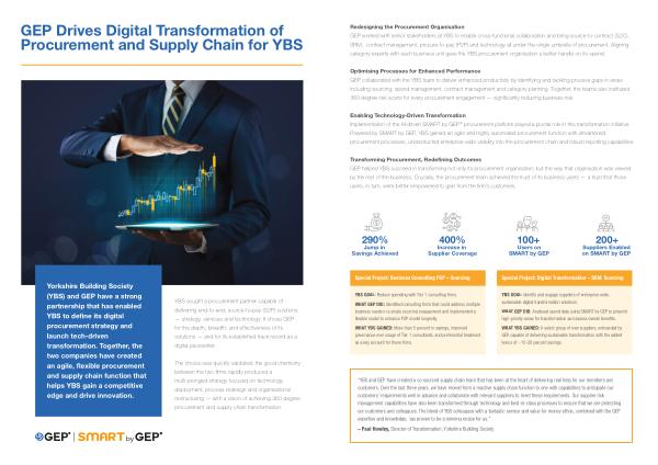 Yorkshire Building Society ( YBS ) and GEP have a strong partnership that has enabled YBS to define its digital procurement strategy and launch tech-driven transformation . Together , the two companies have created an agile , flexible procurement and supply chain function that helps YBS gain a competitive edge and drive innovation .