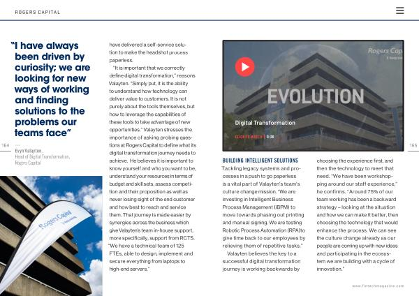 Tackling legacy systems and processes in a push to go paperless is a vital part of Valayten ’ s team ’ s culture change mission . “ We are investing in Intelligent Business Process Management ( iBPM ) to move towards phasing out printing and manual signing . We are testing Robotic Process Automation ( RPA ) to give time back to our employees by relieving them of repetitive tasks .” Valayten believes the key to a successful digital transformation journey is working backwards by choosing the experience first , and then the technology to meet that need . “ We have been workshopping around our staff experience ,” he confirms . “ Around 75 % of our team working has been a backward strategy – looking at the situation and how we can make it better , then choosing the technology that would enhance the process . We can see the culture change already as our people are coming up with new ideas and participating in the ecosystem we are building with a cycle of innovation .” www . fintechmagazine . com