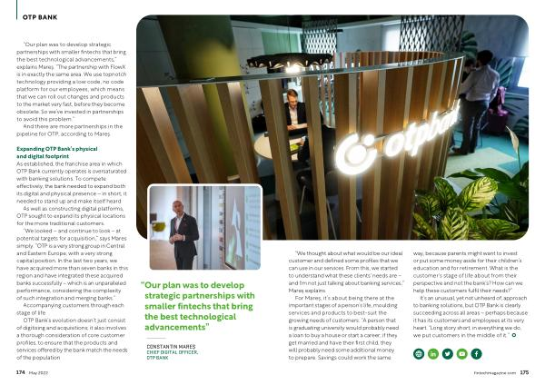 “ Our plan was to develop strategic partnerships with smaller fintechs that bring the best technological advancements ,” explains Mareș . “ The partnership with FlowX is in exactly the same area . We use topnotch technology providing a low code , no code platform for our employees , which means that we can roll out changes and products to the market very fast , before they become obsolete . So we ’ ve invested in partnerships to avoid this problem .”