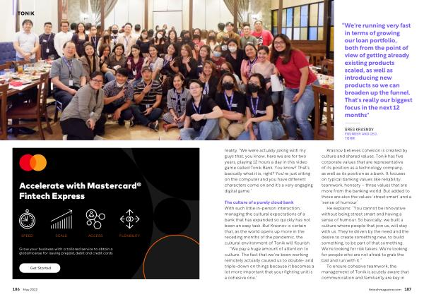 The culture of a purely cloud bank With such little in-person interaction , managing the cultural expectations of a bank that has expanded so quickly has not been an easy task . But Krasnov is certain that , as the world opens up more in the receding months of the pandemic , the cultural environment of Tonik will flourish .