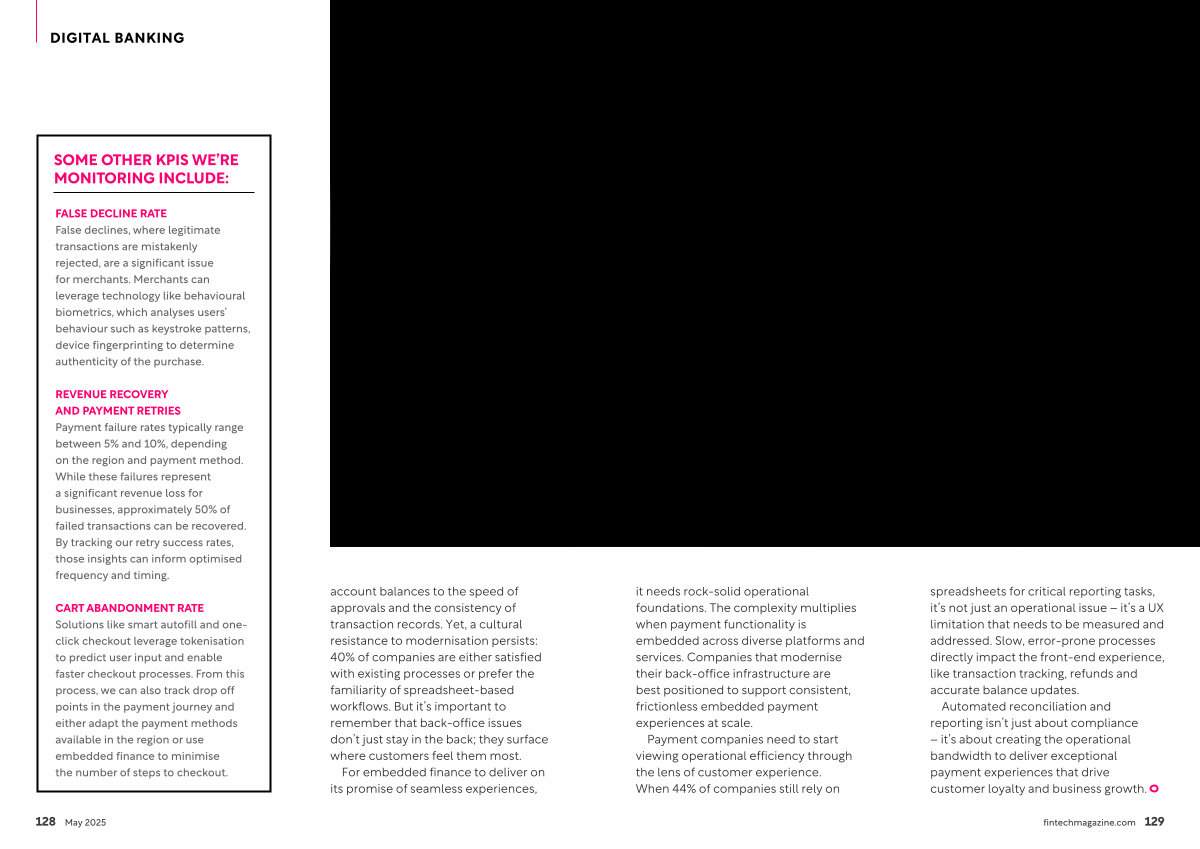 CART ABANDONMENT RATE Solutions like smart autofill and oneclick checkout leverage tokenisation to predict user input and enable faster checkout processes. From this process, we can also track drop off points in the payment journey and either adapt the payment methods available in the region or use embedded finance to minimise the number of steps to checkout. account balances to the speed of approvals and the consistency of transaction records. Yet, a cultural resistance to modernisation persists: 40 % of companies are either satisfied with existing processes or prefer the familiarity of spreadsheet-based workflows. But it’ s important to remember that back-office issues don’ t just stay in the back; they surface where customers feel them most.
