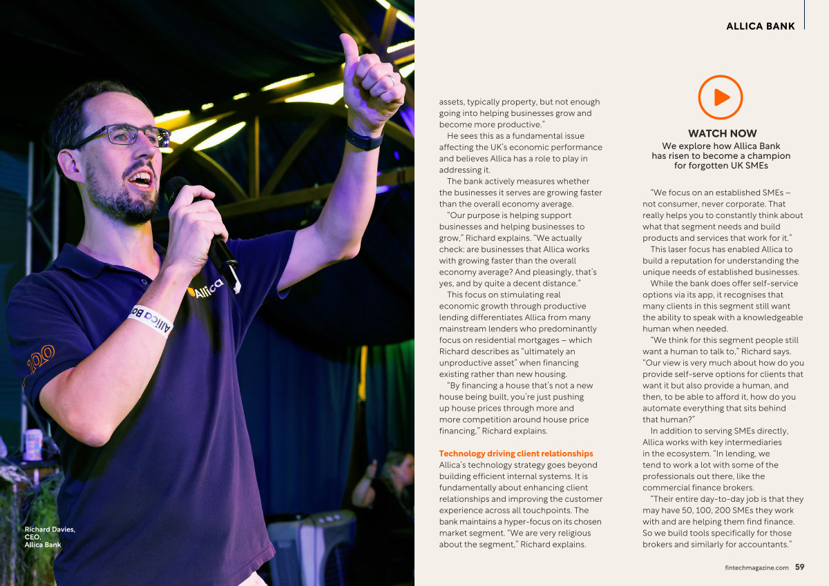 Technology driving client relationships Allica’ s technology strategy goes beyond building efficient internal systems. It is fundamentally about enhancing client relationships and improving the customer experience across all touchpoints. The bank maintains a hyper-focus on its chosen market segment.“ We are very religious about the segment,” Richard explains.
