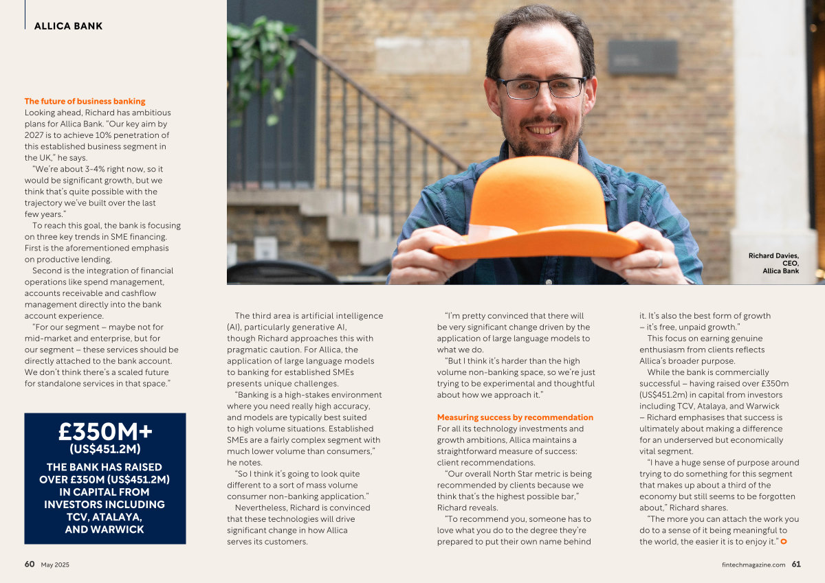 The future of business banking Looking ahead, Richard has ambitious plans for Allica Bank.“ Our key aim by 2027 is to achieve 10 % penetration of this established business segment in the UK,” he says.