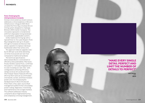 Proto: Challenging the mining hardware monopoly Dorsey’ s most ambitious recent venture addresses a critical weakness in Bitcoin’ s infrastructure. In August 2025, Block unveiled the Proto Rig, a modular Bitcoin mining system designed to challenge Bitmain’ s 80 % market monopoly. The innovation represents a fundamental shift from disposable mining hardware to sustainable, upgradeable systems.