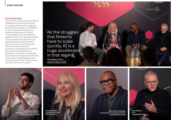 AI in Fintech Panel The AI in Fintech Panel examined Artificial Intelligence’ s impact across financial technology, with estimates suggesting generative AI could add up to US $ 340bn in value to global banking revenues. Panellists moved beyond the hype to share tangible use cases delivering significant results. The discussion tackled critical issues around risk and security, debating whether rapid AI adoption exposes customers to data breaches. The human element featured prominently, exploring how to maintain personal touch while embracing automation. The session concluded by examining AI as an augmenter rather than a replacement, identifying high-value tasks primed for human-AI partnerships over the next three to five years.