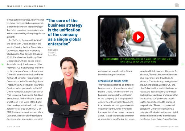 As [ FinTech / Business Chief ANZ ] sits down with Doble , she is in the midst of hosting the first Cover-More CIO Global Alignment Workshop which spans four days ( 6-9 August 2019 ). Cara Morton , the Group Chief Operations Officer based out of Australia has joined several other regional CIOs in attendance to confer on the company ’ s current roadmap . Others in attendance include Paras Kothari , IT Director responsible for Cover-More India TrawellTag ; Steve Frazen , the CIO of Travelex Insurance Services , who operates from the US Office ; Raffaele Loiacono , Director of IT at Universal Assistance SA ; Glen Broadhurst , GM of Global Digital and Direct , who looks after digital direct and optimisation from London ; Jeremy Clutterbuck , the CTO of EMEA insurance services ; and Mark Carnahan , Director of Infrastructure Services , who specialises in digital