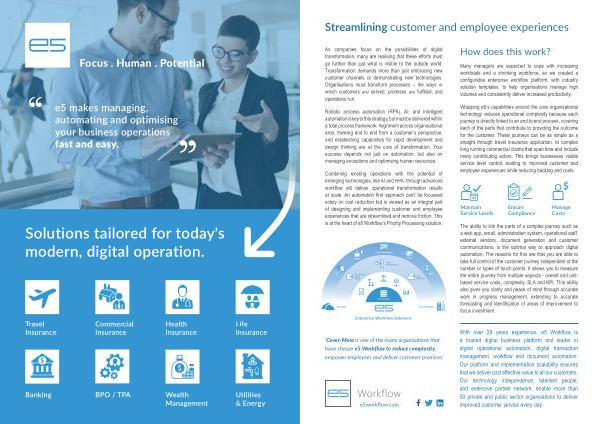 ‘ Cover-More is one of the many organisations that have chosen e5 Workflow to reduce complexity , empower employees and deliver customer promises .’
