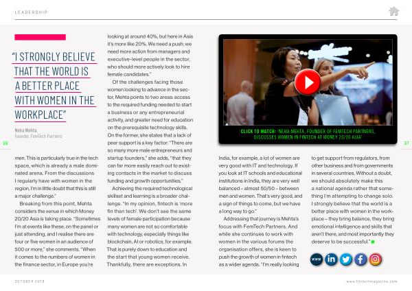 Breaking from this point , Mehta considers the venue in which Money 20 / 20 Asia is taking place . “ Sometimes I ’ m at events like these , on the panel or just attending , and I realise there are four or five women in an audience of 500 or more ,” she comments . “ When it comes to the numbers of women in the finance sector , in Europe you ’ re looking at around 40 %, but here in Asia it ’ s more like 20 %. We need a push ; we need more action from managers and executive-level people in the sector , who should more actively look to hire female candidates .”
