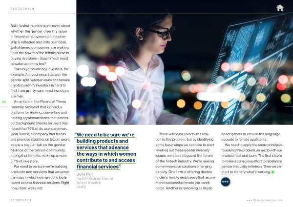 There will be no silver bullet solution to this problem , but by identifying some basic steps we can take to start levelling out these gender diversity issues , we can safeguard the future of the fintech industry . We ’ re seeing some innovative solutions emerging already . One firm is offering double finder ’ s fees to employees that recommend successful female job candidates . Another is reviewing all its job descriptions to ensure the language appeals to female applicants .