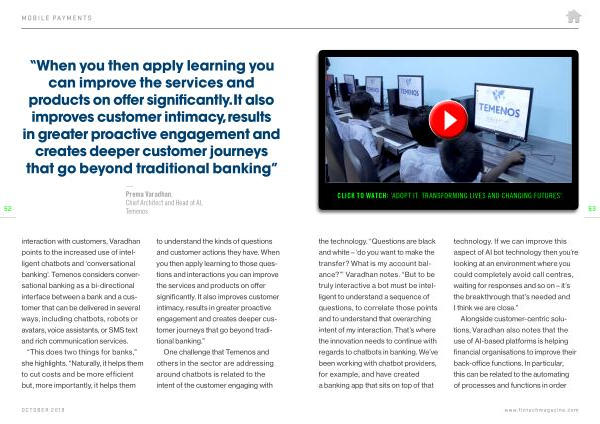 interaction with customers , Varadhan points to the increased use of intelligent chatbots and ‘ conversational banking ’. Temenos considers conversational banking as a bi-directional interface between a bank and a customer that can be delivered in several ways , including chatbots , robots or avatars , voice assistants , or SMS text and rich communication services .