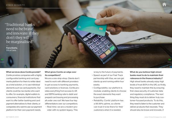 What services does Contis provide ? Contis provides companies with a highly configurable banking and card payments platform for them to white-label as a total solution , or to use individual elements such as card payments . Our clients could be neo banks who want to offer , for example , digital wallets to consumers ; financial institutions that want to offer better banking and card payment alternatives to their clients ; or companies who want to use our payment platform for their own payment needs .