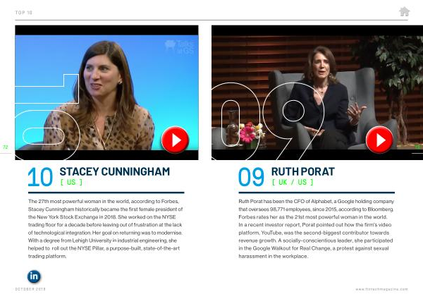 Ruth Porat has been the CFO of Alphabet , a Google holding company that oversees 98,771 employees , since 2015 , according to Bloomberg . Forbes rates her as the 21st most powerful woman in the world . In a recent investor report , Porat pointed out how the firm ’ s video platform , YouTube , was the second-biggest contributor towards revenue growth . A socially-conscientious leader , she participated in the Google Walkout for Real Change , a protest against sexual harassment in the workplace . www . fintechmagazine . com