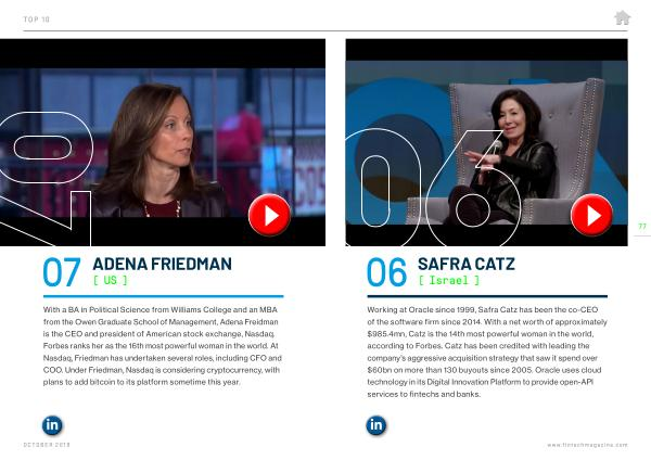 With a BA in Political Science from Williams College and an MBA from the Owen Graduate School of Management , Adena Freidman is the CEO and president of American stock exchange , Nasdaq . Forbes ranks her as the 16th most powerful woman in the world . At Nasdaq , Friedman has undertaken several roles , including CFO and COO . Under Friedman , Nasdaq is considering cryptocurrency , with plans to add bitcoin to its platform sometime this year . OCTOBER 2019