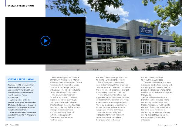VyStar still operates physical branches and continues a strong community presence. But even these activities now involve digital elements, from branch staff using tablets to assist members to community partnerships teaching coding skills as they prepare the mentor the next generation of leaders. fintechmagazine. com 119