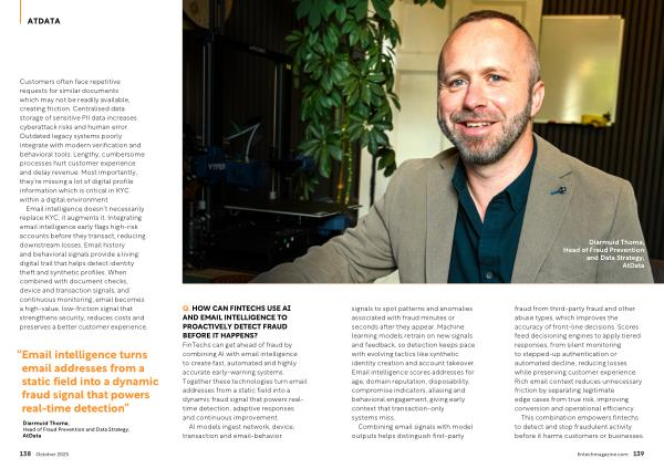 Diarmuid Thoma, Head of Fraud Prevention and Data Strategy, AtData signals to spot patterns and anomalies associated with fraud minutes or seconds after they appear. Machine learning models retrain on new signals and feedback, so detection keeps pace with evolving tactics like synthetic identity creation and account takeover. Email intelligence scores addresses for age, domain reputation, disposability, compromise indicators, aliasing and behavioral engagement, giving early context that transaction-only systems miss.