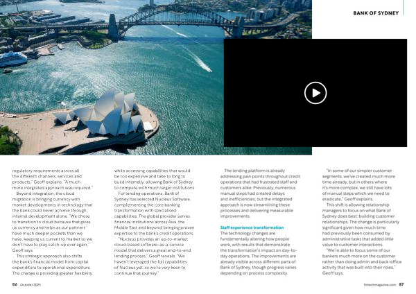 “ We’ re able to focus some of our bankers much more on the customer rather than doing admin and back-office activity that was built into their roles,” Geoff says. fintechmagazine. com 87