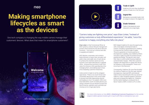 MCE helped Vodafone UK seize the opportunity , with a fully digital omnichannel trade-in solution , including a guaranteed price , enabling it to become the country ’ s trade-in leader . The price guarantee , an elusive goal due to discrepancies in grading , was enabled by MCE ’ s innovative , highly accurate AI-powered remote grading technology . The app put users ( and their reps ) in control while ensuring Vodafone achieved better margins . “ When the customer engages with diagnostics to grade their device ; the valuation is fully transparent . There ’ s a lot more trust in the final price .”