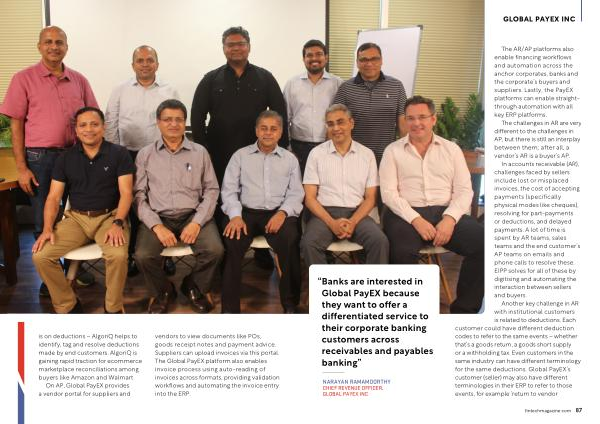 is on deductions – AlgoriQ helps to identify , tag and resolve deductions made by end customers . AlgoriQ is gaining rapid traction for ecommerce marketplace reconciliations among buyers like Amazon and Walmart . On AP , Global PayEX provides a vendor portal for suppliers and vendors to view documents like POs , goods receipt notes and payment advice . Suppliers can upload invoices via this portal . The Global PayEX platform also enables invoice process using auto-reading of invoices across formats , providing validation workflows and automating the invoice entry into the ERP .