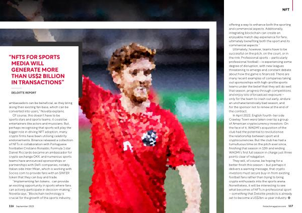 ambassadors can be beneficial , as they bring along their existing fan base , which can be converted into users ,” Novella explains . Of course , this doesn ’ t have to be sports stars and sports teams ; it could be entertainers like actors and musicians . But , perhaps recognising that sports will play the bigger role in driving NFT adoption , many crypto firms have been utilising celebrity endorsements . Binance released a collection of NFTs in collaboration with Portuguese footballer Cristiano Ronaldo ; Formula 1 star Daniel Ricciardo became an ambassador for crypto exchange OKX ; and numerous sports teams have announced sponsorships or partnerships with DeFi companies , notably Italian side Inter Milan , which is working with Socios . com to provide fans with an $ INTER token that they can buy and trade .