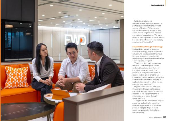 Sustainability through technology Sustainability is another key area where technology plays an important role at FWD. Sandeep sees the move to cloud services as contributing significantly to reducing the company’ s environmental footprint.
