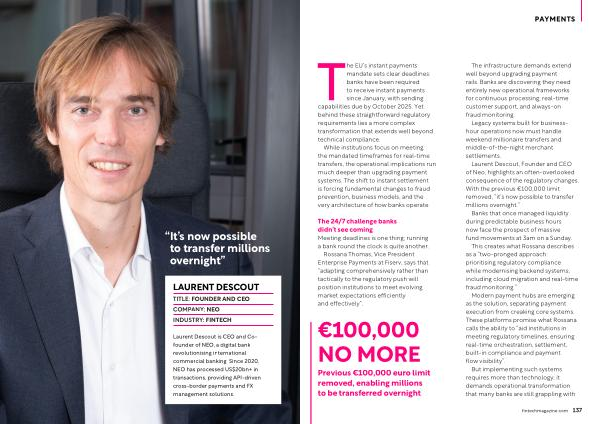 Laurent Descout, Founder and CEO of Neo, highlights an often-overlooked consequence of the regulatory changes. With the previous € 100,000 limit removed,“ it’ s now possible to transfer millions overnight.”