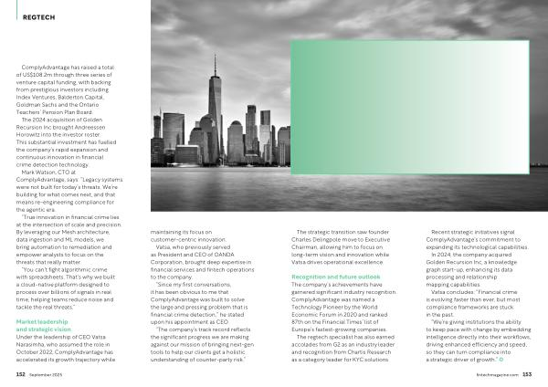Recognition and future outlook The company’ s achievements have garnered significant industry recognition. ComplyAdvantage was named a Technology Pioneer by the World Economic Forum in 2020 and ranked 87th on the Financial Times’ list of Europe’ s fastest-growing companies.