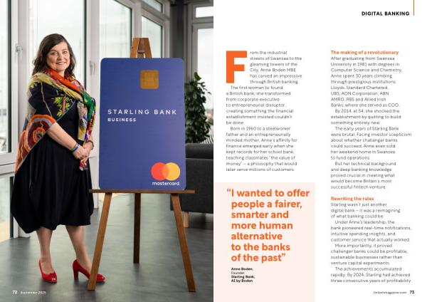 From the industrial streets of Swansea to the gleaming towers of the City, Anne Boden MBE has carved an impressive through British banking. The first woman to found a British bank, she transformed from corporate executive to entrepreneurial disruptor, creating something the financial establishment insisted couldn’ t be done.