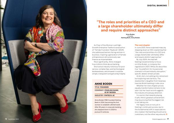 Anne Boden MBE founded Starling Bank in 2014, becoming the first woman to establish a British bank. After 30 years in corporate banking, she stepped down in 2024 to pursue AI ventures.