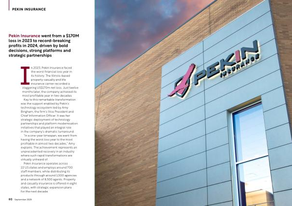 In 2023, Pekin Insurance faced the worst financial loss year in its history. The Illinois-based property casualty and life insurance carrier recorded a staggering US $ 170m net loss. Just twelve months later, the company achieved its most profitable year in two decades. Key to this remarkable transformation was the support enabled by Pekin’ s technology ecosystem led by Amy Bingham, the firm’ s Vice President and Chief Information Officer. It was her strategic deployment of technology partnerships and platform modernisation initiatives that played an integral role in the company’ s dramatic turnaround.