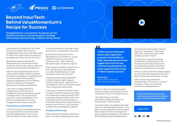 By enlisting the help of partners like ValueMomentum and Guidewire – a cloudbased P & C insurance core systems software provider – Pekin’ s team was afforded the agility it needed to respond.